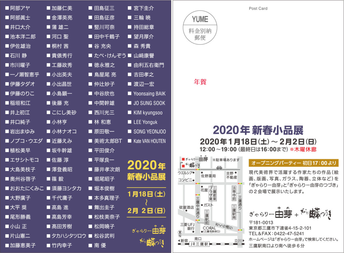 「ぎゃらりー由芽」と「ぎゃらりー由芽のつづき」の2会場に、国内・国外の現代美術界で活躍する作家たちの作品が勢揃い。絵画、版画、写真、ガラス、陶器、立体などの個性的でサイズも価格も手ごろな作品がいっぱいです。コレクションやプレゼントにぜひどうぞ。
