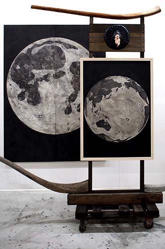 本展示では地球を満月に見立て、作家が好きな歌手ニーナ・シモンの『Everyone’s gone to the moon』をタイトルにし、将来宇宙に住むようになるだろう人間が、思いを馳せる故郷の地球を表現しています。「これは昨今の環境破壊が著しい人間中心主義的思考に対する警鐘である」と、もりわじんは言います。