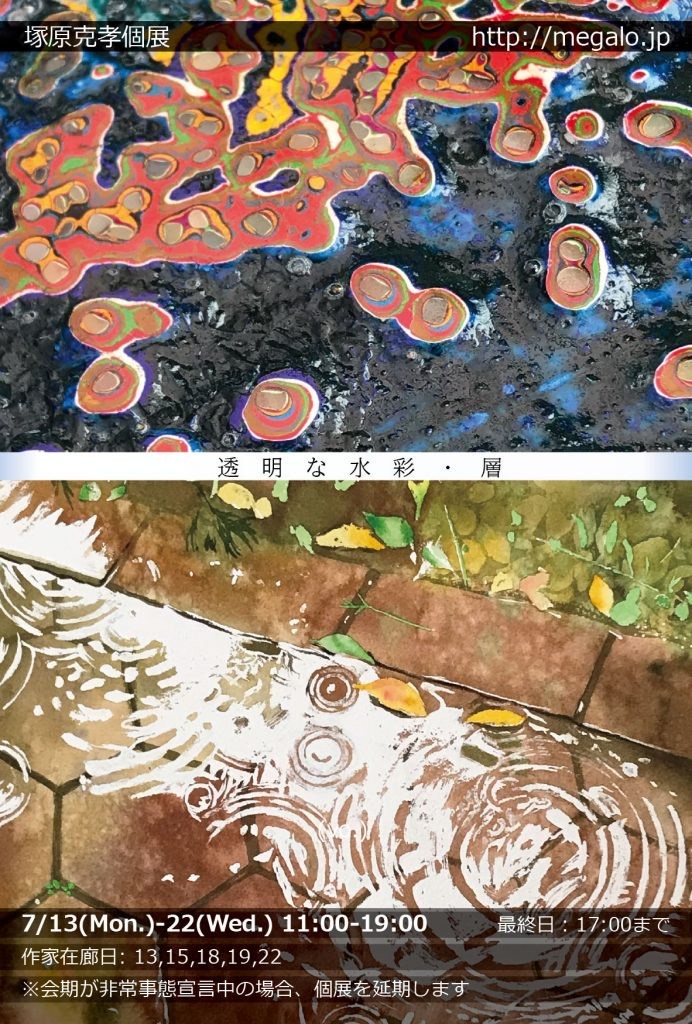 塚原克孝の個展です。透明感のある水彩画と一部非具象絵画の展示もあります。