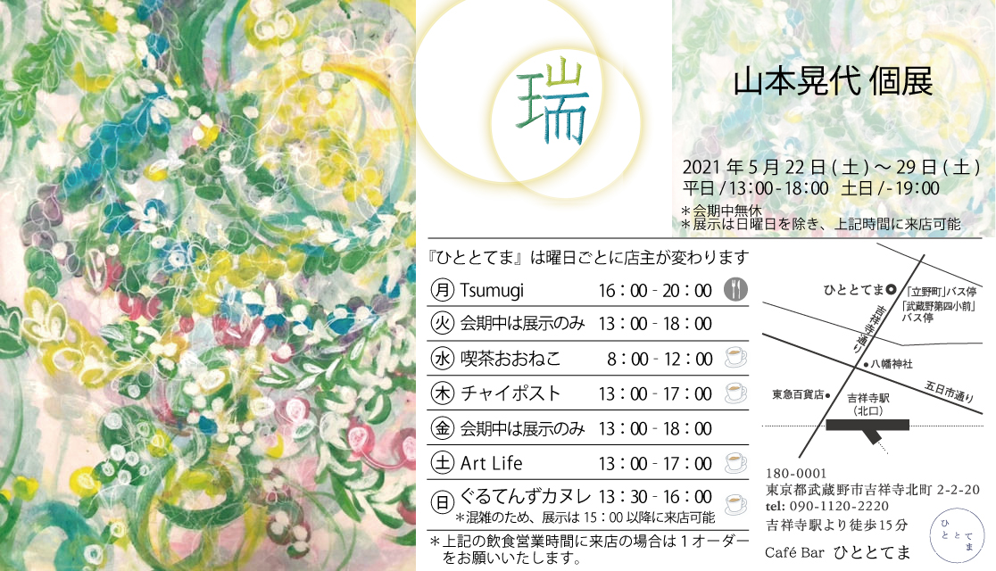 【Cafe Bar ひととてま】では2021年5月22日(土)~5月29日(土)まで、「瑞~山本晃代個展」を開催いたします。