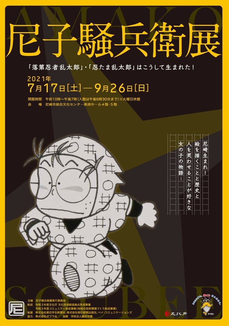 これまで、「落第忍者乱太郎」の原画展や「忍たま乱太郎」展は、全国各地で開催されてきましたが、本展は、初めて漫画家「尼子騒兵衛」に焦点をあてた展覧会です。絵を描くことが好き、歴史が好き、面白いことを伝えたい、という尼子の漫画家として根底にあるもの、そして広がる乱太郎の世界における原作者としての仕事などについて、原画や資料、約1,500点を通じて紹介し、その人物像に迫ります。