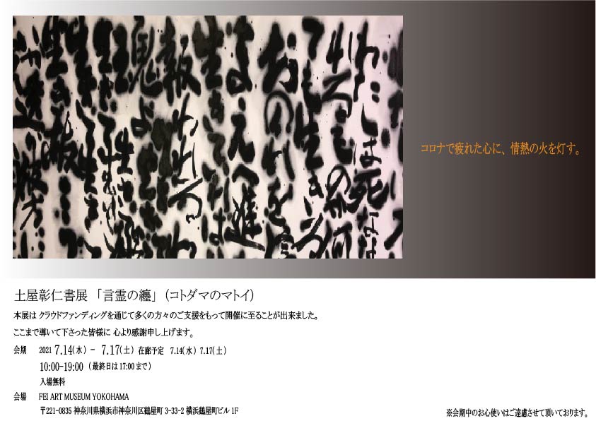 このたびFEI ART MUSEUM YOKOHAMAでは、ホテルマン出身、不動明王の精神を持つ書家 土屋彰仁が主催する言霊個展『土屋彰仁書展「言霊の纏(まとい)」』を開催致します。