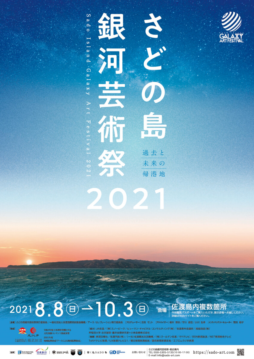 佐渡島の自然や歴史、点在する民話や伝承を掘りおこし、島内外からの刺激とともに新しい創造空間をつくり出し、「銀河」のようなきらめきや美的価値観を創造していくことを目的に「さどの島銀河芸術祭2021」を開催いたします。島内各地で、作品展示やアートイベントを行います。会場には、寺社や漁港、廃校、舟小屋、棚田など既知の観光地とは異なるスポットを訪ねてもらうことで、地域のことをより深く知ってもらう一助になれればと考えています。