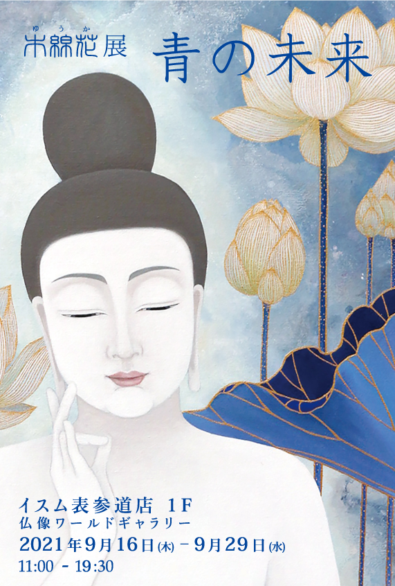 観音画家として活躍中の若手作家 木綿花(ゆうか)の、当ギャラリーでは2年ぶりとなる作品展です。平和や幸福の象徴とされる「青色」をテーマに描いた観音様や蓮華などの絵画や版画、51点を展示販売します。毎回売り切れとなる会場限定販売品「たまゆらキーホルダー」も、美しい青をまとって登場します。