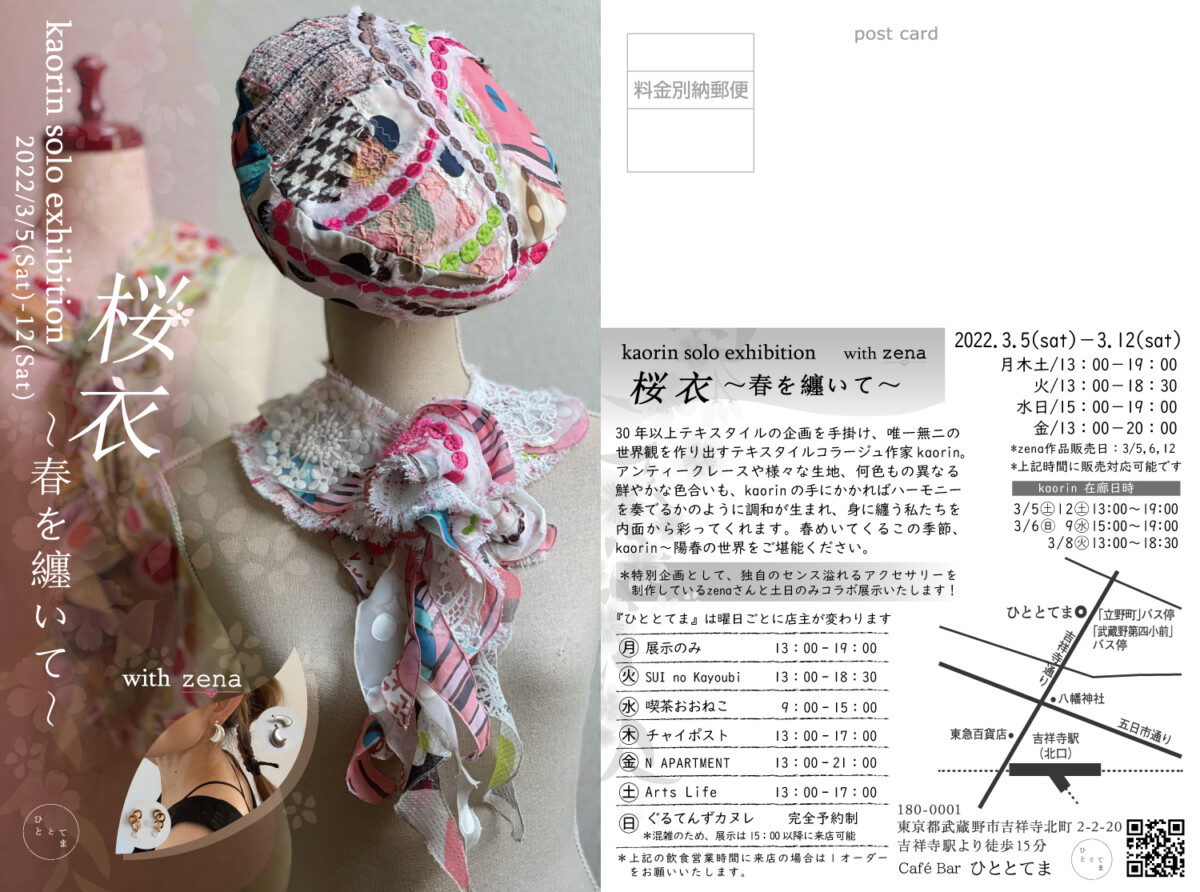 ひととてまでは、kaorin solo exhibition「桜衣~春を纏いて~」with zena を開催いたします。