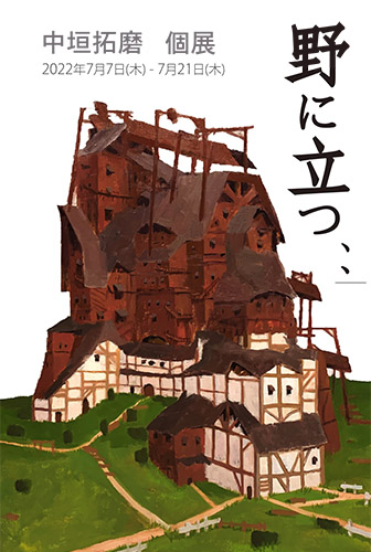 中垣は一貫して家、建築をモチーフにして制作しています。自然採取した流木や、打ち捨てられた段ボール、時には廃業した銭湯のボイラー室の廃材を使用している為、ある種うごめくような生命力が感じられる生体建築のシリーズや前回は Point of View と題し、コロナ禍の中、家というものを見つめ直し、自分と他の距離感について、外から見た自分と内から見た自分、外から見た他人と内から見た他人、というような視点を転換した中垣にとって変化のある作品を展示して頂きました。今回、中垣は油彩の空想建築シリーズを展示するといいます。作家から届いた作品画像は増改築を繰り返したようなやはり、不思議な生命体のような感覚を覚える作品でした。