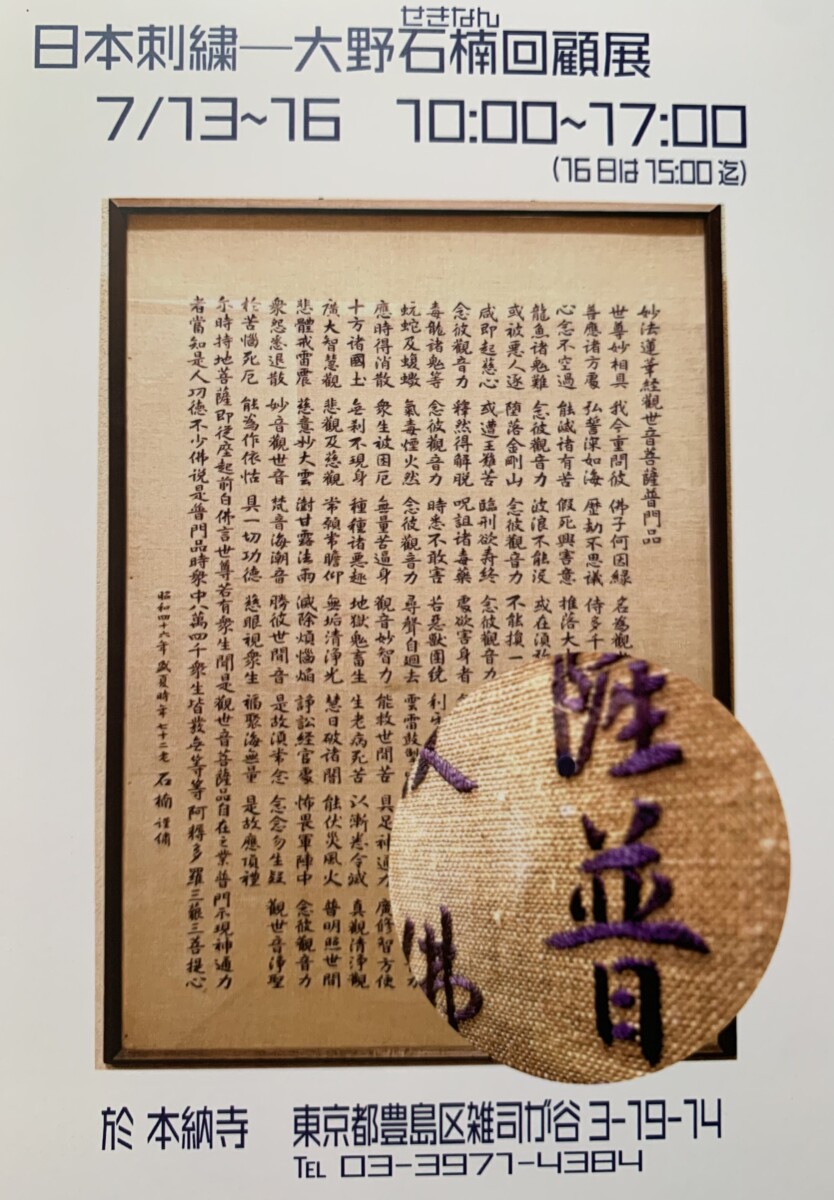 日本刺繍で作られた作品30点ばかりを期間限定で公開いたします。刺繍とは思えない写経の刺繍から、華やかな屏風絵など、昭和に作られた石楠の作品を観ることができます。 雑司ヶ谷にある本納寺にて、無料で展覧いたします。 日本刺繍にご興味ある方は、散歩がてら足を運び下さい。