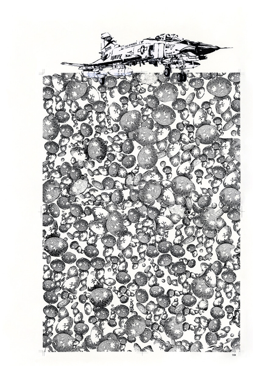 昨秋、榎が70年代当時使用していた戦闘機ドローイングの版をノマルのシルクスクリーン技術で復元したことから計画はスタート。さらにその頃世間を賑わせていた、海底火山から噴出された軽石が日本各地の海岸へ漂着したという話題が榎のイマジネーションを掻き立て、「軽石(Pumice)」がモチーフのひとつとなりました。