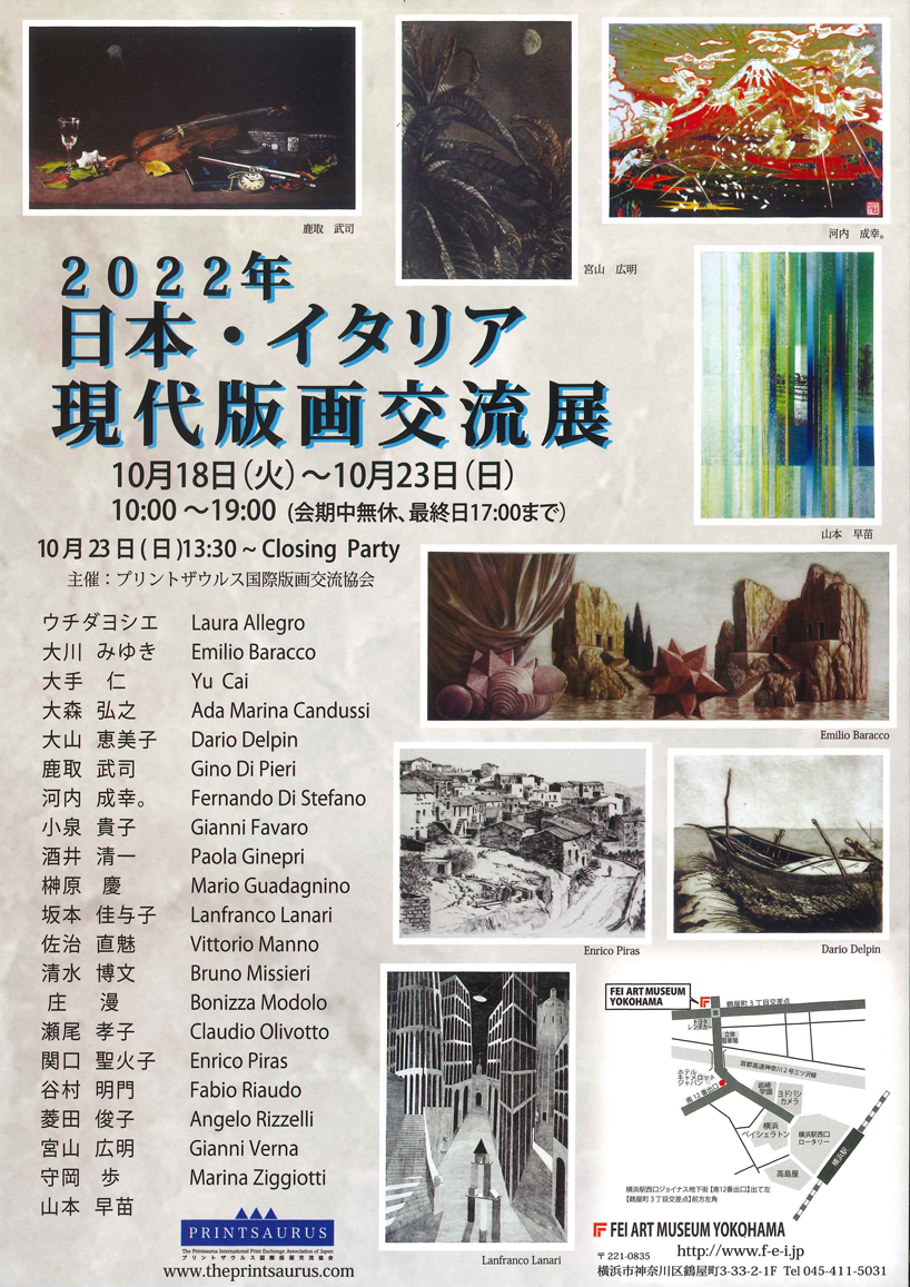 1987年に中華民国の若手版画家との交流展をきっかけに発足したグループ「プリントザウルス国際版画交流協会」は、日本美術界の枠を越えて国内のみならず世界各国と版画の交流を進めてまいりました。メンバーの一人である宮山広明氏の呼びかけにより始まったイタリアとの交流もその一つであり、これまでにイタリア各地に於いて交流展が数度開催されました。日本作家もイタリア作家との交流を深め、次第に規模は大きくなりましたが、日本では未だ交流展が開催されておりませんでした。