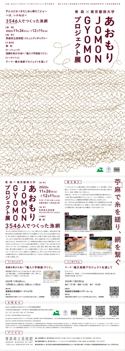 「あおもりJOMON GYOMOプロジェクト」では、縄文文化から着想し、美術の視点で想像力を育む文化芸術体験・学習プログラムを展開しています。 私たちの生活様式や文化は、長い年月の中で幾度も磨きをかけ、意識することが無くなる程に生活に根差してきました。 あまりに身近な存在である習慣や仕草に、新しい価値を見いだすことは容易な事ではありませんが、身近な営みの中にこそ、時間を超える豊かさを含んだ種が潜んでいるのではないかと考えました。そうした過去の種の萌芽から、未来を「つなぐ」架け橋こそが本プロジェクトです。つなぐ対象は幅広く、生活文化、美術、歴史、教育、地域、林業、漁業、作品、等々を様々な角度から「つなぐ」活動を実践しています。そして、青森から発信されたアートと言うメディウムは、全国の人々を繋ぎました。多くの人の手(3,546人:2022/8/26時点)で制作した大型漁網作品を中心に、取組の全体を表す展示として「あおもりJOMON GYOMOプロジェクト展」を開催します。