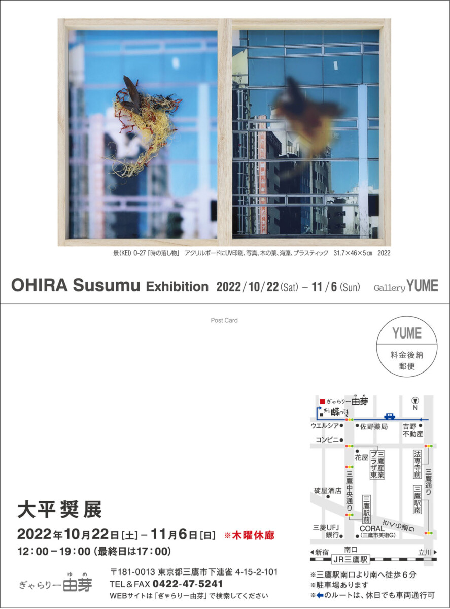人は朝昼晩、春夏秋冬といった円環を形作る時の流れの中で日々暮らしており、永遠に変わらないように見える風景、街、そして生きとし生けるものすべてのものが変化して行きます。私達の目は一秒一秒の変化をとらえることはできません。自分が、「今」見ているものはすでに「今」ではないように思えます。見ること、見えること、そして記憶について考えています。(大平奨)