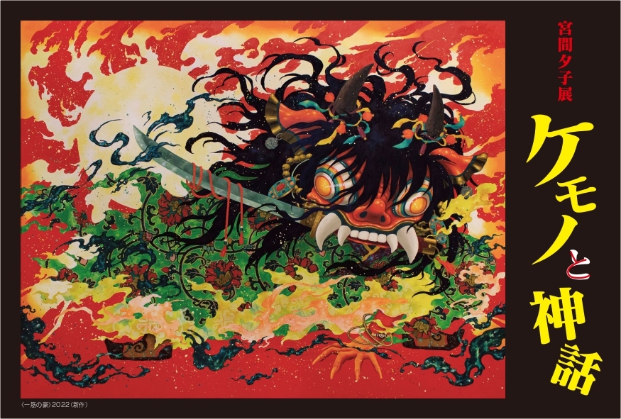 個展「ケモノと神話」は私の描く作品の本能的な側面と、貴き存在に対しての憧れや敬意を提示したいと思いその名をつけました。神話や伝承に数多く登場する動物・獣達は勇ましく聡明で気高く特別な動物として描かれてきました。獅子、狼、鹿、鳥など人間離れした強大な力を持つ獣達は神獣として位置づけられてきました。その姿は野性的で何にも屈せず敵に牙をむく英雄としての神聖さを放ちながら自然から成るむき出しの本能に溢れています。ケモノは神話と共に息づきそして今もなお私達を引き付ける存在だと考えています。――― 宮間夕子