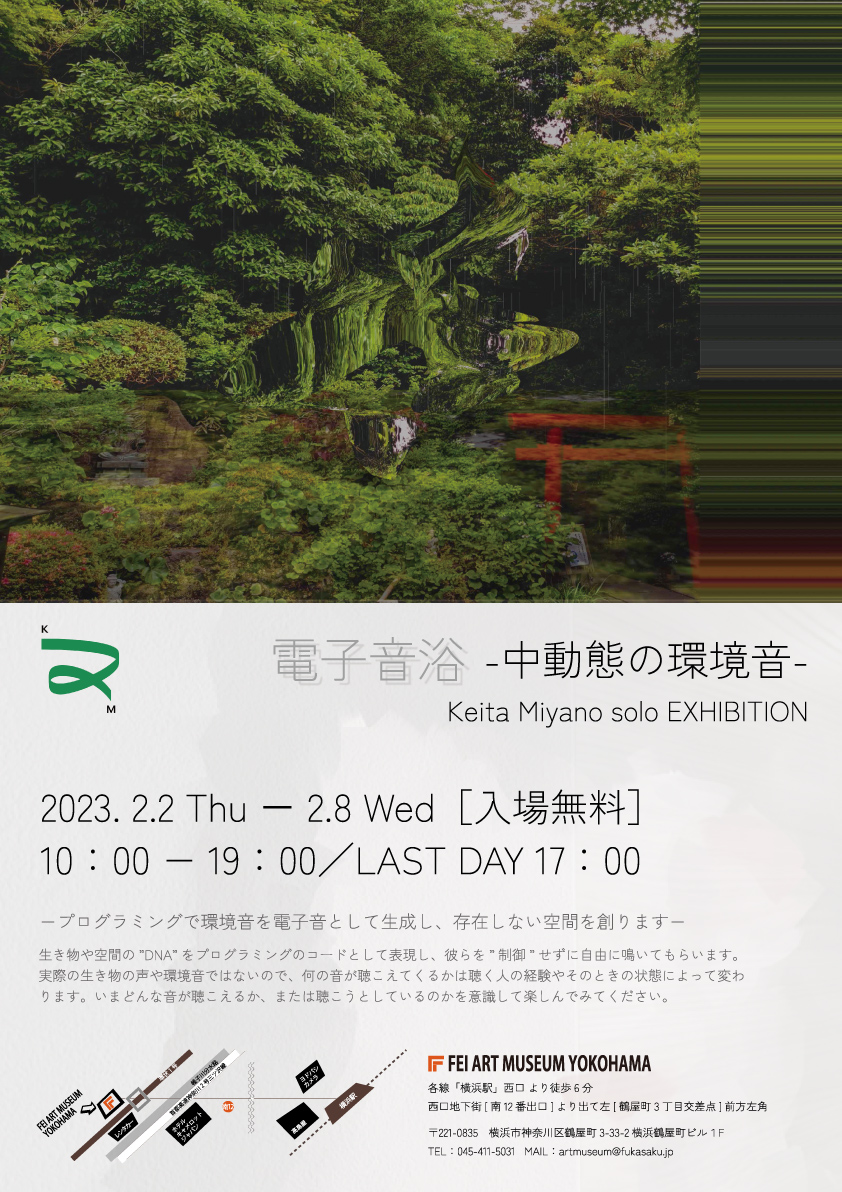 このたびFEI ART MUSEUM YOKOHAMAでは、環境音アーティストのKeita Miyanoの初個展「電子音浴 -中動態の環境音-」を開催致します。