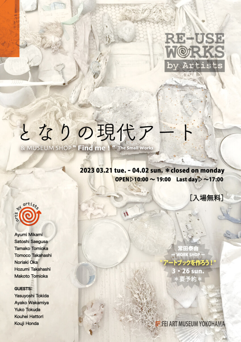 このたびFEI ART MUSEUM YOKOHAMAでは、「人とアート作品が出逢える様々な場所と演出を、自ら試みる」をテーマに発表を続けるアーティストのグループ「arts by artists」による「RE-USE WORKS by Artists となりの現代アート」展を開催致します。