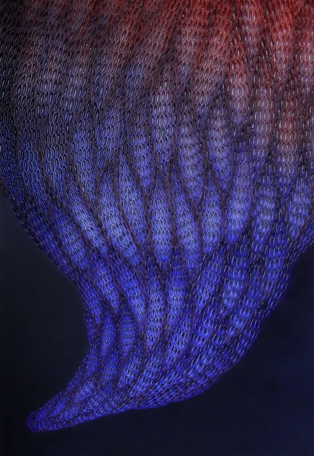 浅井は和歌山県出身、現在は東京を拠点に活動しています。幼い頃から現在に至るまで、何かに集中すると必ず透明の細長い粒状の物体「うねうね」が視界に現れるという不思議な幻覚症状を持っています。視界に浮かんでくる「うねうね」をモチーフに、自身の感情の動きやうねうねが持つ美しさを色彩豊かに表現する作品を制作し続けています。