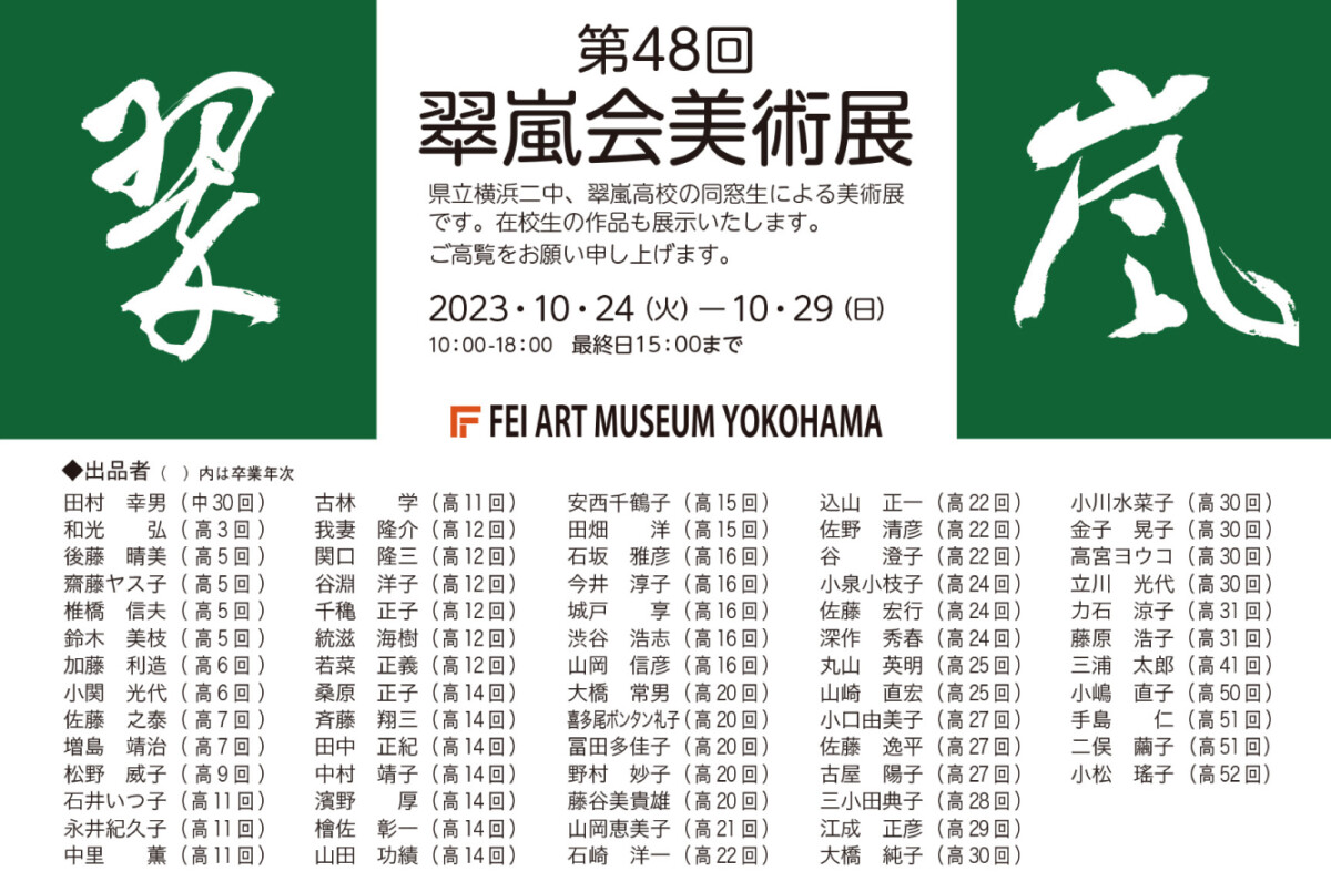 このたびフェイ アートミュージアム ヨコハマでは、神奈川県有数の進学校として名高い神奈川県立横浜翠嵐高等学校(旧 県立横浜二中)の同窓生による美術展「翠嵐会美術展」を開催いたします。