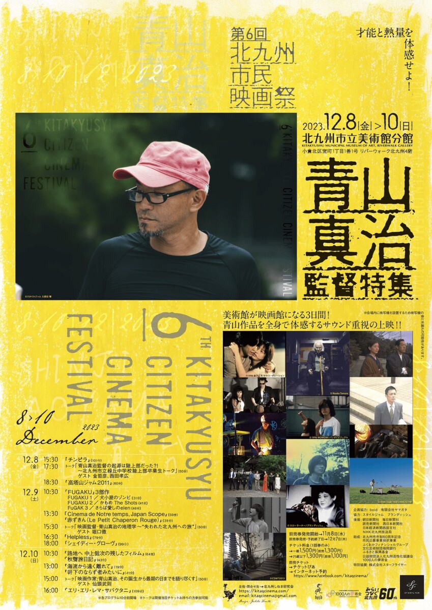 映画監督・⻘⼭真治の声かけで市内の映画好き市⺠ボランティアスタッフが集まりスタートした「北九州市⺠映画祭」。第6回を迎える今回は「⻘⼭真治監督特集」と銘打ち、⻘⼭の⻑編映画デビュー作であり”北九州サーガ“第1作の『Helpless』(1996年)や、『⾼塔⼭ジャム2011』(2011年)、『⾚ずきん』(2008年)、『FUGAKU』3部作(2013~2015年)などビデオ化されておらず滅多に鑑賞する事の出来ない貴重な作品まで計14作品、厳選した特集上映を⾏います。