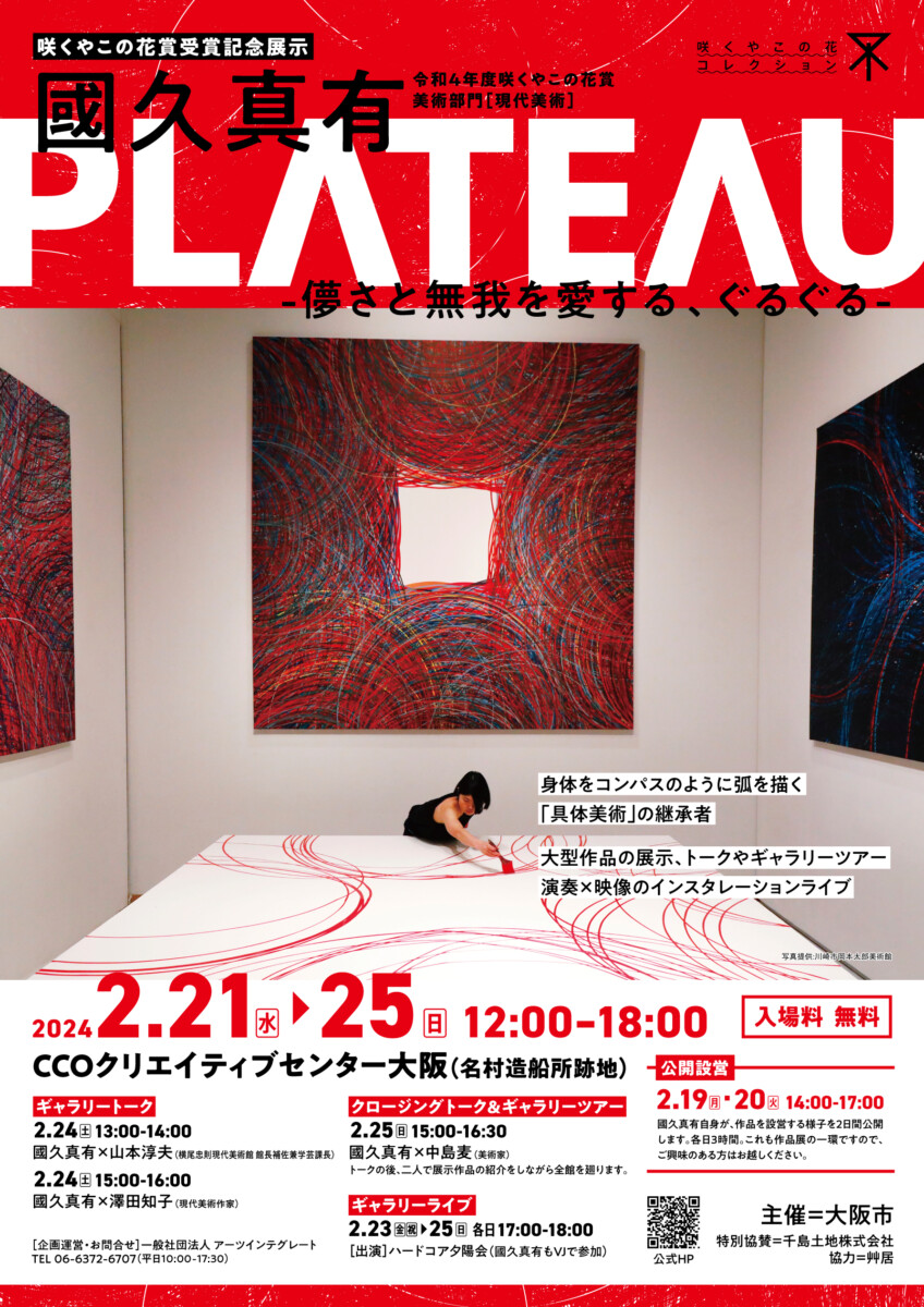 身体をコンパスのように弧を描く「具体美術」の継承者。令和4年度咲くやこの花賞(美術部門)を受賞した画家・國久真有による展示を大阪・北加賀屋で開催。大型作品の展示の他、2/24(土)ギャラリートーク、2/25(日)クロージングトーク&ギャラリーツアー、2/23(金・祝)~25(日)ギャラリーライブを開催。2/19(月)・20(火)には自信初の試みとして、展示する様子を観覧する「公開設営」を行う。