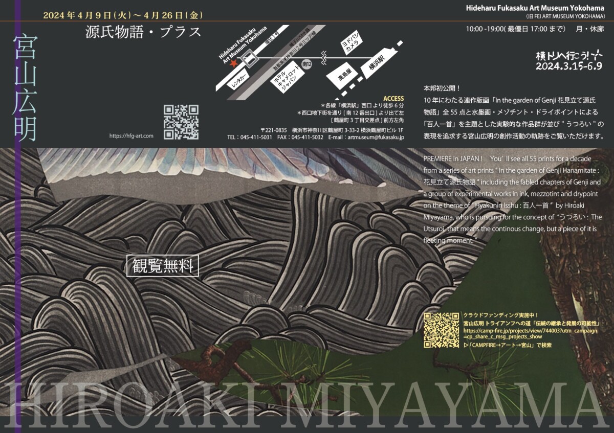 幻とされる章も含め10年にわたる連作版画「In the garden of Genji 花見立て源氏物語」全55帖と、実験的に行った水墨画・メゾチント・ドライポイントによる「百人一首」を主題とした作品群が並び、宮山広明の創作活動の軌跡をご覧いただけます。