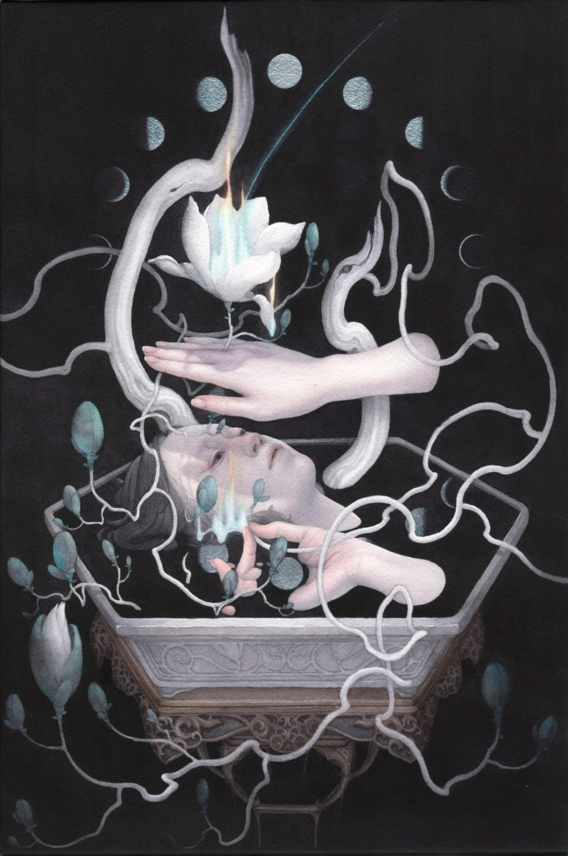 朱華氏は、時に豊かに、時に色数を抑えるなど色彩を自在に操りながら、卓越した透明水彩の技法で画材の特徴であるぼかしや滲みを活かしつつ、モチーフや背景の細部まで精緻に描き、濃密な画面を作り出すイラストレーターです。