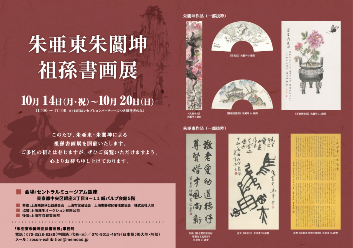 儒学者の祖「南宋の朱熹」の直系子孫であり、中国・上海で活動する書道家 朱亜東とその孫 朱闐坤が、日本国内初となる書画展「朱亜東×朱闐坤 祖孫書画展」を東京・銀座にて10月14日(月・祝)より開催いたします。今回、朱亜東と朱闐坤、祖孫共同の書画展としては2021年の上海での開催に次ぐ2回目の開催であり、朱亜東、朱闐坤共に、日本国内で個展を開催するのは初めての試みとなります。今回の書画展は、祖孫がテーマとしている「人生は芸術の旅」を体現するようなものであり、過去の個展で好評を得た作品を一挙展示いたします。(全72点展示予定)
