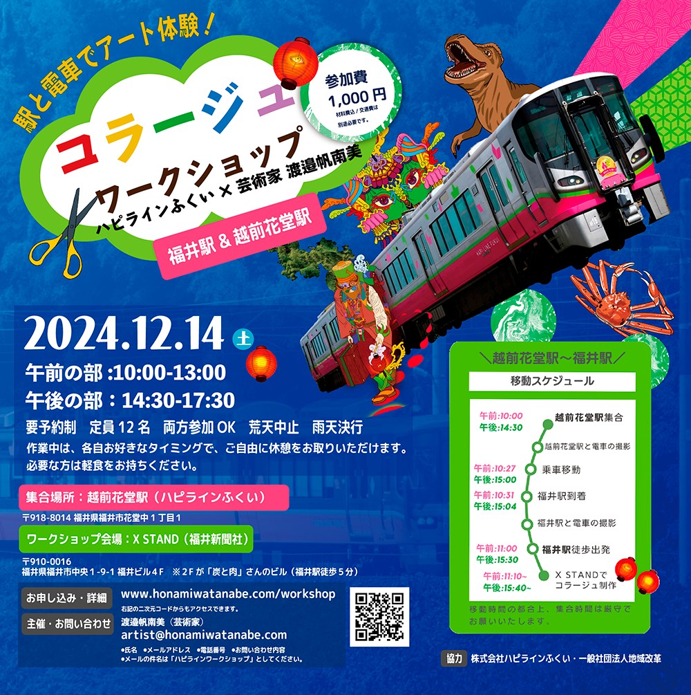 本ワークショップでは、越前花堂駅から福井駅へ電車で移動しながら、駅や電車の面白い瞬間をカメラに収め、それを使ってオリジナルのコラージュアートを作ります。