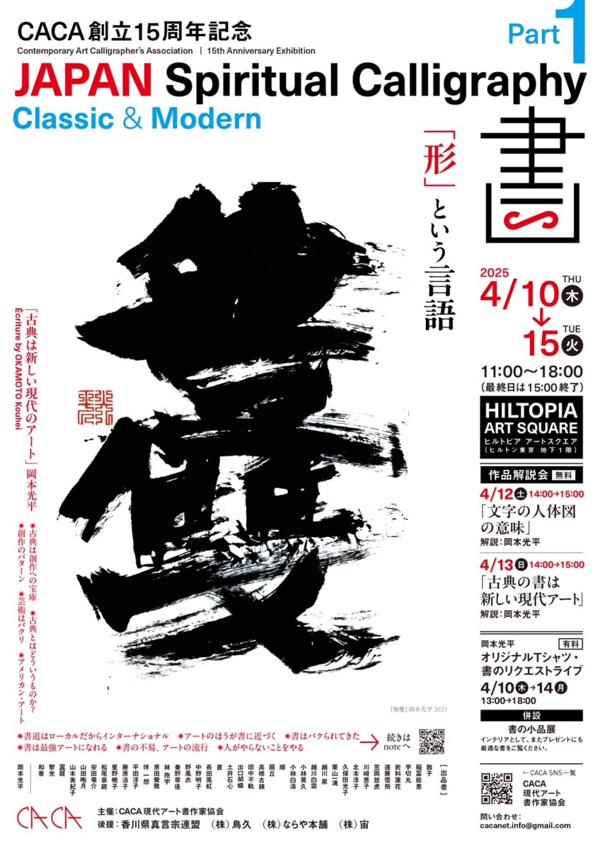 今回展は、CACA現代アート書作家協会15周年記念展として2部構成としており、第1部は「JAPAN Spiritual Calligraphy【書】Classic & Modern~「形」という言語~」と題し、書の古典をベースとし、そのエッセンスと筆の技術を用い、現代的なアレンジを加えた書作品約40点を発表いたします。