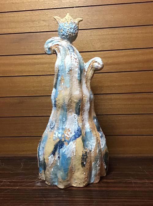 今回のオブジェの発想は、実体のないもの・みえないもの・触れないものをイメージした。例として霊とか空(くう)など・・・ 実際の作品は土ぽい感じにしたかったので、陶土を変えて土の感じが現れるようにしてみた。そして釉薬(うわぐすり)も試行錯誤して土を生かした表現にした。 (伊藤タダオ)