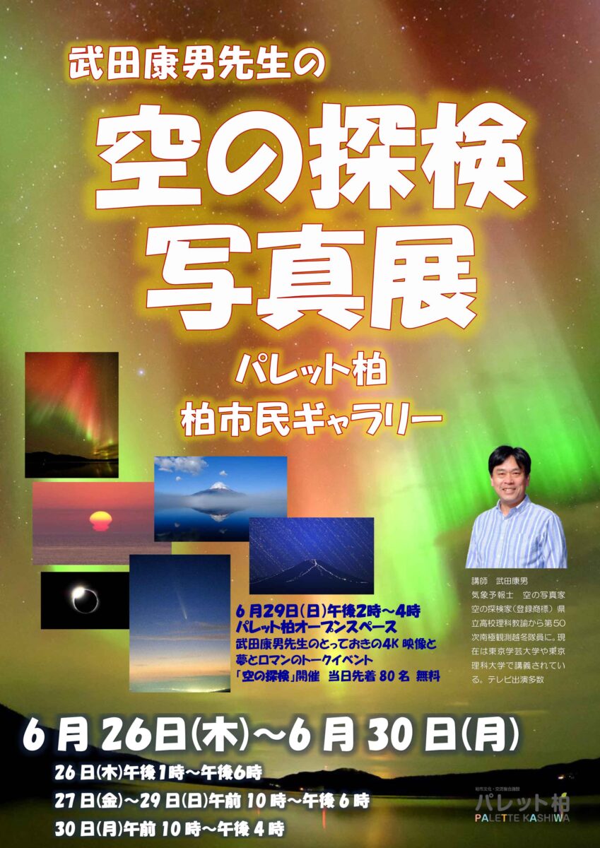 「空の探検家」としてさまざまな空の現象を記録し、第50次南極観測越冬隊にも参加した武田康男さんの空の写真展を開催します。海外(南極を含む)、日本、柏などで撮影した夢とロマンあふれる空の写真を展示し、迫力の4K動画も紹介します。様々な表情をみせる「空」をご堪能ください。
