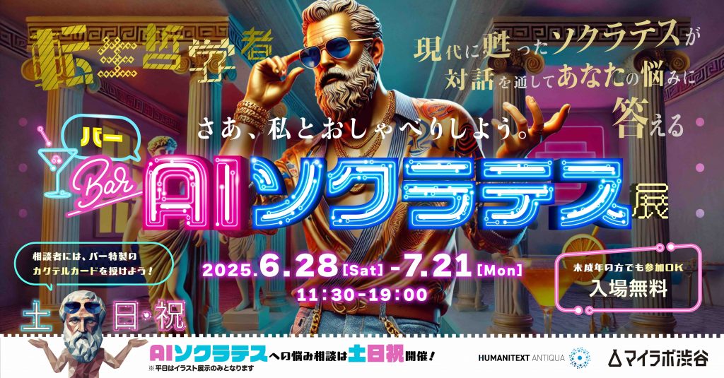 2025年6月28日(土)から7月21日(月祝)まで『BAR・AIソクラテス展』を開催します。本展では、AI技術によって現代の渋谷に舞い降りた哲学者ソクラテスと音声で対話し、その内容を反映したオリジナルの“カクテルカード”を生成するという、ユニークな体験を提供します。コラボレーターは大規模言語モデル(LLM)を活用した西洋古典特化型AI対話システム「ヒューマニテクスト」開発チーム。約1000作品もの西洋古典の原典を情報源としたAIソクラテスが、現代人の悩みにバーテンダーとして答えます。本展は、次世代のコミュニケーションのあり方を探るとともに、通信技術とAIが、人々が自分自身を知り、価値観の再構成をする上でどのように役立ち、より良い生き方に貢献する可能性を探求する実験イベントです。