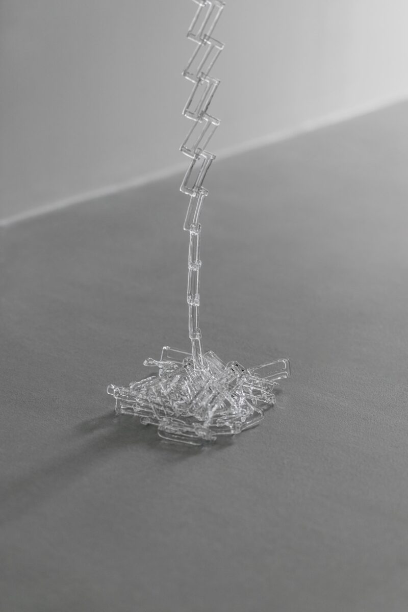 透明なガラスのパーツを一つずつ手作業で繋ぎ合わせ、感情や記憶、事物や人間の関係性といった、目には見えにくい無形とされるものを、ガラスを用いて作られた線やかたち、光を通して立ち上げています。
