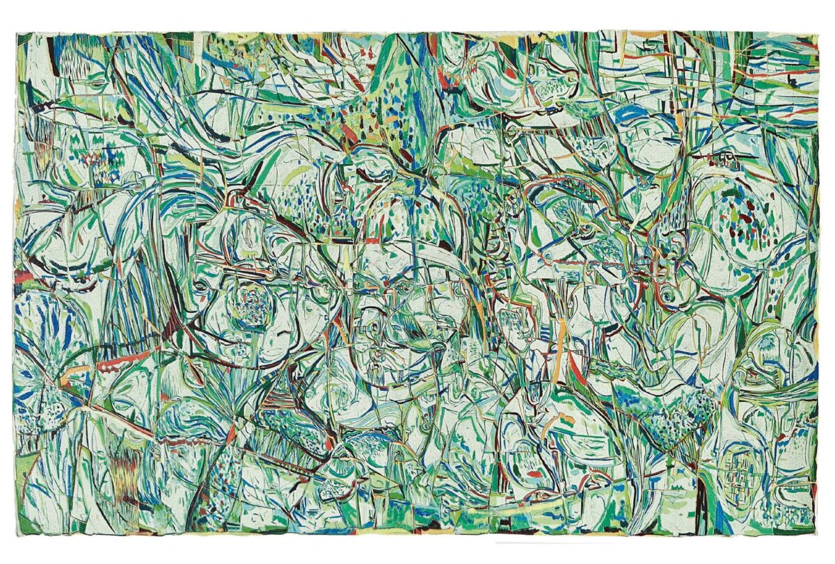 韓国と日本の美術大学で版画を学んだ李は「彫り進み木版画」技法(1枚の版を使った多色刷り技法。1色刷り終えるごとに版を彫り、次の色を刷る)で制作します。後戻りのできない技法で勢いよく生み出されるラインと鮮やかな色彩は、エネルギーと自信に溢れています。
