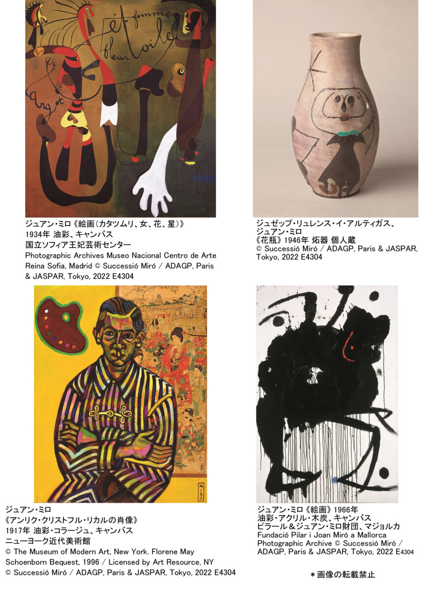 本展では、若き日の日本への憧れを象徴する初期作品から代表作、そして日本で初めて展示されたミロ作品を通し、相思相愛であったこの画家と日本の関係に迫ります。さらに本人のアトリエにあった日本の民芸品や批評家の瀧口修造との交流を示す多彩な資料を通してミロと日本の深いつながりを紐解き、ミロというよく知られた画家を約130点の作品と資料で新たな角度からご紹介します。