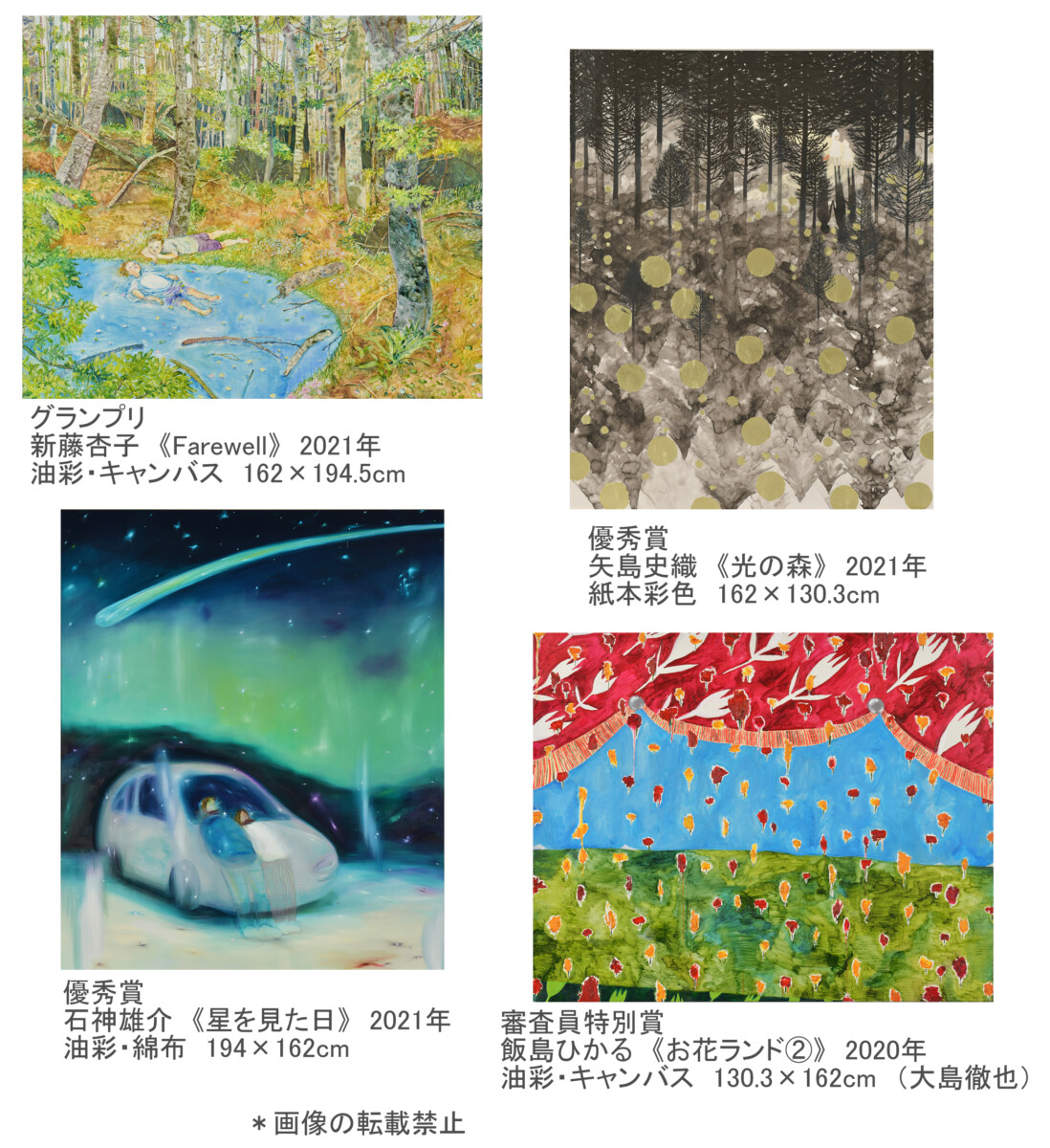 不確かな社会情勢の中、創作活動には困難を伴いますが、昨年同様に今回の応募作品には、時代の感覚を捉えた輝く作品が数多くありました。油彩、アクリル、水彩、岩絵具、版画、ミクストメディアなど技法やモチーフは多岐にわたりますが、見る者の心に潤いと感動をもたらしてくれることは共通しています。
