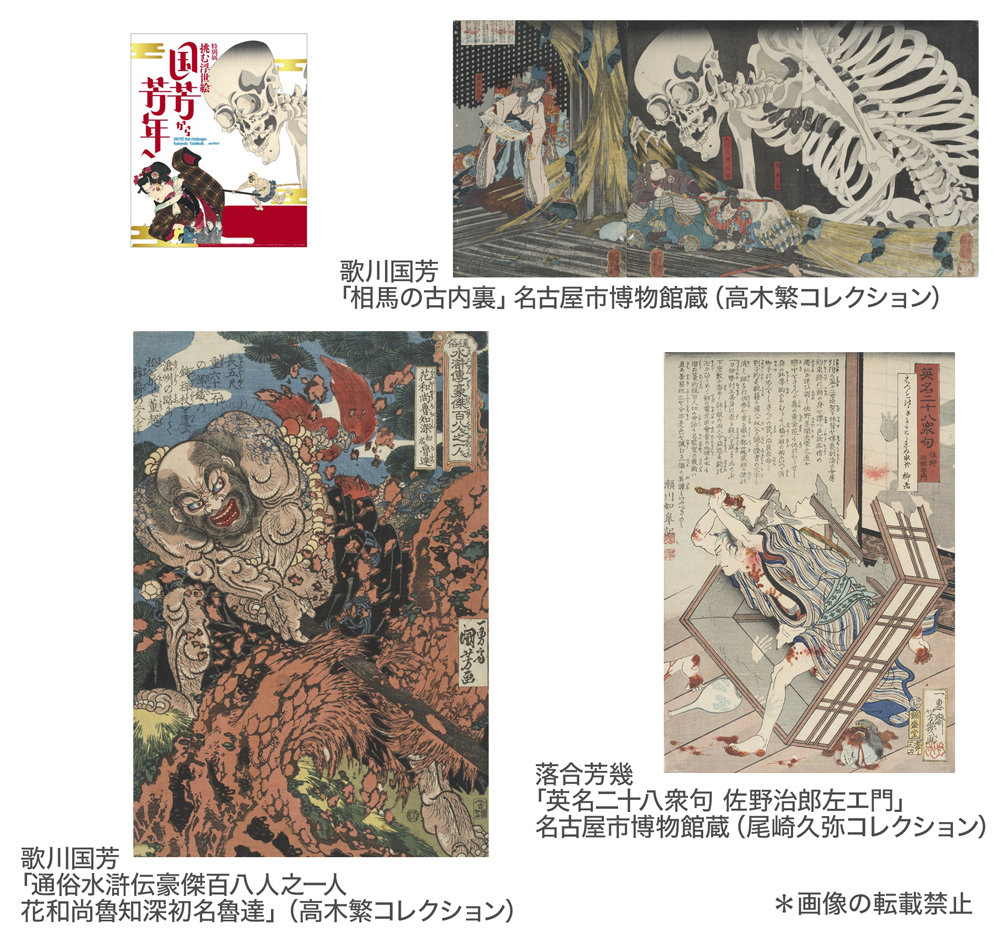歌川国芳(1797-1861)は、ダイナミックな武者絵やユニークな戯画で、幕末の浮世絵に衝撃をもたらしました。国芳のもとには多くの弟子が集い、新しい画題や表現に挑みました。中でも月岡芳年(1839-92)は近年再評価が進み、浮世絵のイメージをくつがえす絵師として知られています。 幕末、激動する時代のうねりを生き、描き、人々を魅了し続けた「芳」の系譜。怖い絵も、華やかな絵も、実は悲しい絵も、ぱっと目をひく表現が彼らの得意技です。名古屋市博物館の浮世絵コレクションから選り抜かれた約150点をご紹介します。(一部にショッキングな表現が含まれます)