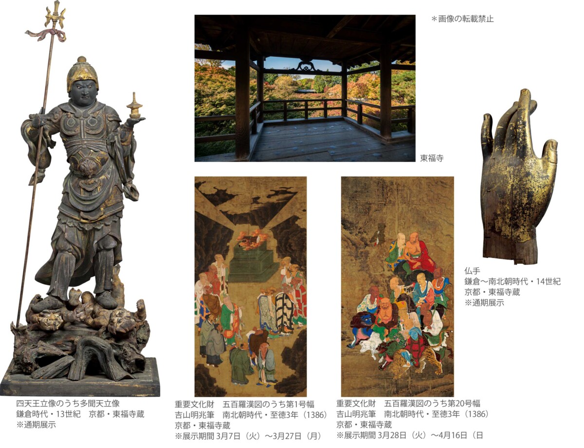 東福寺の寺宝をまとめて紹介する初の機会となる本展では、伝説の絵仏師・明兆(みんちょう)による記念碑的大作「五百羅漢図(ごひゃくらかんず)」現存全幅を修理後初公開するとともに、巨大伽藍にふさわしい特大サイズの仏像や書画類も一堂に展観いたします(会期中展示替えがあります)。草創以来の東福寺の歴史を辿りつつ、大陸との交流を通して花開いた禅宗文化の全容を幅広く紹介し、東福寺の日本文化における意義とその魅力を余すところなくご覧いただきます。