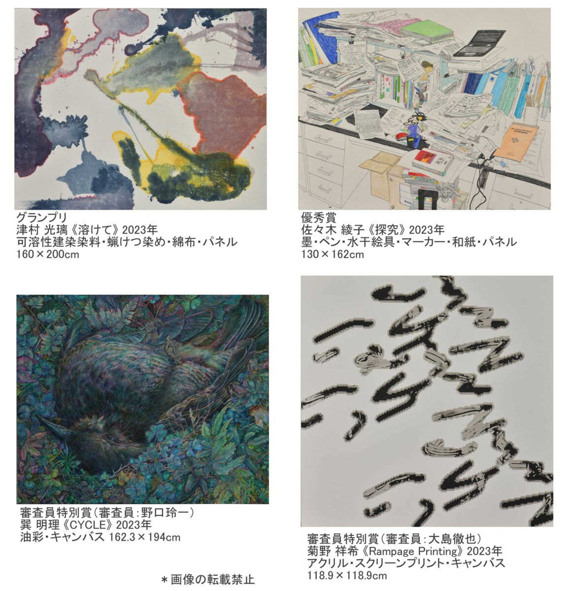 不確かな社会情勢の中、創作活動には困難を伴いますが、昨年同様に今回の応募作品には、時代の感覚を捉えた輝く作品が数多くありました。油彩、アクリル、水彩、岩絵具、版画、ミクストメディアなど技法モチーフは多岐にわたりますが、見る者の心に潤いと感動をもたらしてくれることは共通しています。