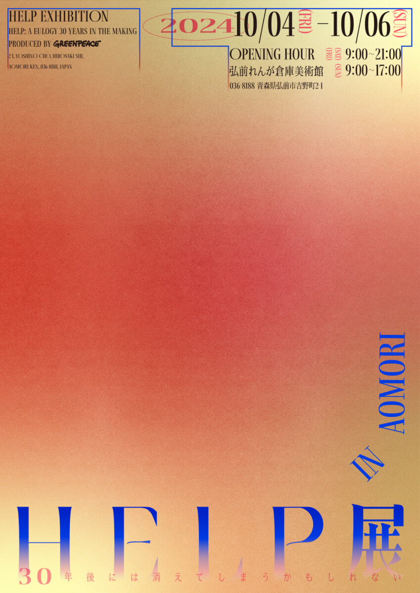国際環境NGOグリーンピース・ジャパンは、10月4日(金)、5日(土)、6日(日)の3日間、青森県弘前市の弘前れんが倉庫美術館 市民ギャラリー・スタジオにて、日本における気候変動の影響をアートで感じる展覧会「HELP展〜30年後には消えてしまうかもしれない In AOMORI〜」を開催します。