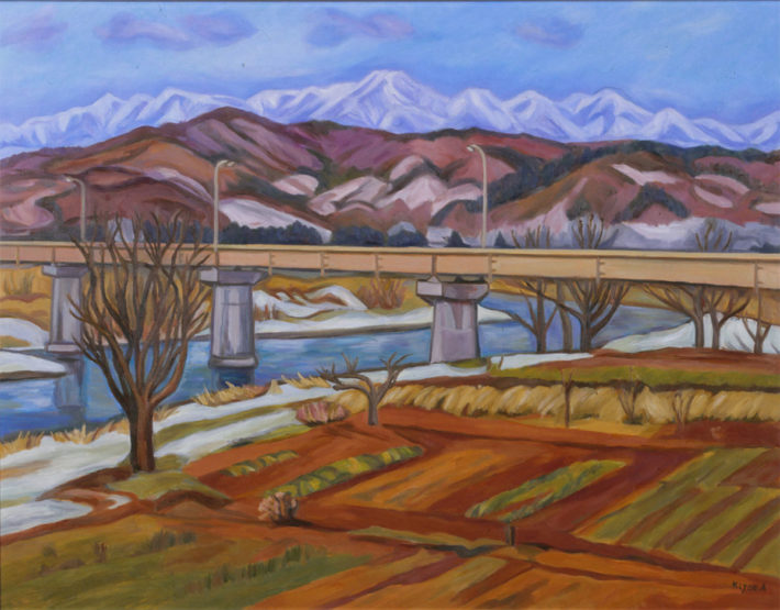 長野市小島田町中村 千曲川右岸より南西を望む 2000年3月写生